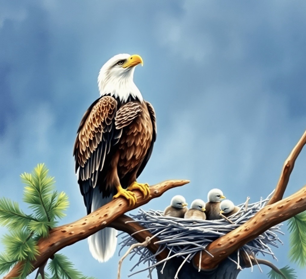 Listening to Eirene’s deep and soothing voice, Reya felt peace settle in his heart. Gratefully, he touched his chest with his wings, a tear dropping from his eyes. Majestic and watchful, he perched on Eirene’s ancient branches, his yellow beak shining like shimmering gold. His sharp yet gentle eyes gazed at his family nest, where his young chicks slept peacefully.